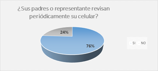 Tal como lo especificas la tabla y grafico N° 1 de los 107 adolescentes encuestados el 24% de sus padres revisan el celular de los menores, pero un porcentaje mayor del 76% no lo realizan, es decir no controla su uso.