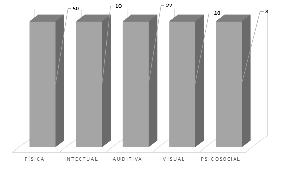 El 50% de los encuestados se relaciona con discapacidad física, el 10% con la intelectual, el 22% auditiva, 10% en discapacidad visual y el 8% en relación a la psicosocial.