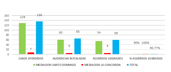 Durante el periodo comprendido de enero 2017 a octubre 2019, el Centro Nacional de Mediación de la Fundación Judicial a través de su oficina de mediación de la provincia de Santo Domingo de los Tsáchilas atendió un total de 136 casos derivados en materia familia de familia por asunto de alimentos, de los cuales instalaron 65 casos, lo que representa el 47,79% del total de casos ingresados; de los caso instalados, se logró el 90,77% en acuerdos sobre las audiencias instaladas, es decir que de cada 6 casos tuvieron imposibilidad de acuerdo.