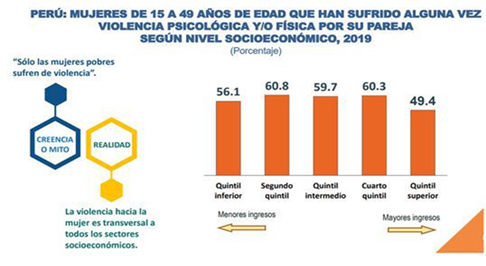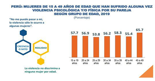 En el siguiente apartado se muestra un resumen del trabajo periodístico realizado por Luja (2020) del diario La República, del Perú en donde manifiesta que 6 de cada 10 mujeres fueron víctimas de violencia, según el INEI. Por ejemplo, se cree que solo las mujeres sin educación o las más empobrecidas son violentadas por su pareja, cuando las cifras demuestran que las que tienen formación académica superior y poseen mayores ingresos también son agredidas. Es decir, la violencia contra la mujer es transversal a todos los sectores socioeconómicos y no discrimina, debido a que abarca a mujeres de todos los grupos etarios.