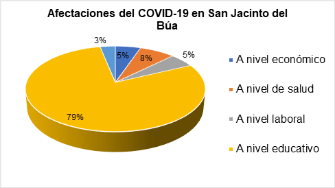De los datos estadísticos obtenidos a la primera interrogante el 79% de los encuestados manifiestan que las afectaciones del COVID-19 en San Jacinto del Búa son mayores a nivel educativo, por cuanto las limitaciones existentes en la actualidad y su difícil acceso impiden el desarrollo u ejercicio de este derecho a un importante grupo de atención.