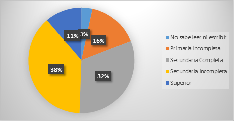 El nivel de escolaridad de las mujeres del grupo indica que la mayoría tienen secundaria incompleta con un porcentaje de 38%, mientras que la primaria incompleta tiene un 16% y el 3% dicen no saber leer ni escribir y otras no terminaron la Superior. Uno de los aspectos que se toman en cuenta a la hora de establecer cuáles son las causas o agentes causantes que derivan a una violencia de género, está determinado que la educación según estudios juega un papel importante para mejorar o disminuir los casos de discriminación, agresión sexual o violencia de género, especialmente dentro de una pareja o familia.
