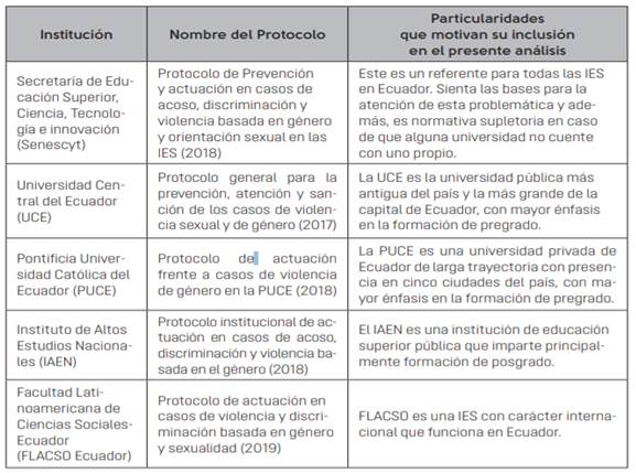 Nota: Adaptado de: Tabla de Selección de protocolos de actuación en casos de violencia de género en instituciones de educación superior, de Defensoría del Pueblo de Ecuador y Universidad UTE, 2020 (http://repositorio.dpe.gob.ec)