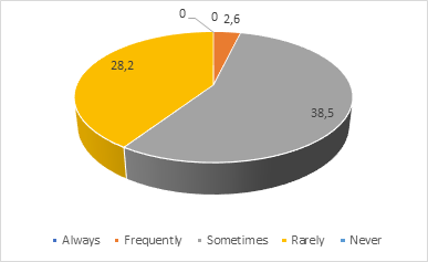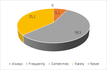 From table and figure 2, it was possible to show that of the students say the teacher sometimes uses audiovisual resources to develop the English class. The use of audio-visual increases learners’ communication skills so that trainees can concentrate on improving their skills through audio-visuals (Singh, 2018). These materials can be as good as the teacher when explaining concepts, facts, or demonstrating procedures, everything depends on the creativity used (Reyes et al. 2020). These authors also state audio-visual material has brought new opportunities to teachers and students to broaden and innovate the way how to teach and learn.