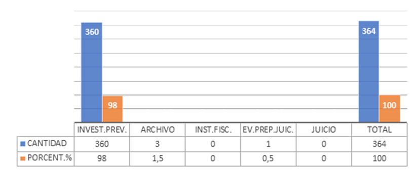 La totalidad de investigaciones el 98% se encuentra en etapa de investigación previa, y son precisamente estas investigaciones las que generan la sobre carga procesal referida, ya que como es obvio, existen investigaciones que aún se encuentran vigentes y que corresponden a años anteriores y al año que está en decurso, cuyos porcentajes son similares a los del año 2021 que han sido expuestos en el presente artículo; esto sin contar con las investigaciones por delitos de naturaleza sexual que también se conoce en este despacho.