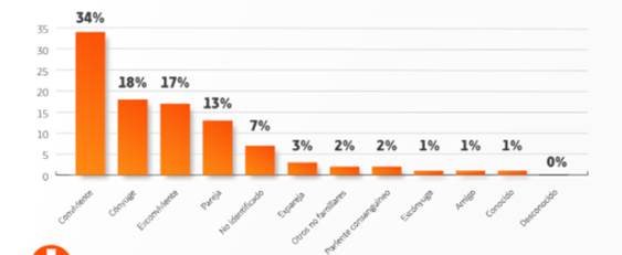 Tras un Análisis realizado por la fiscalía general del Estado (FGE) en el año 2020 sobre la Violencia de genero determina y permite conocer la relación que tiene el agresor con la victima en lo cual se determina los casos de femicidio cometidos por el conviviente son de un 34%, cónyuge un 18%, exconviviente un 17% y pareja 13%. Lo cual permite destacar en la mayoría de los casos el agresor se encuentra cerca de la víctima.