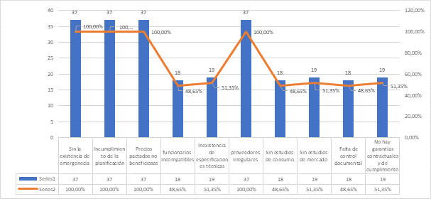 De las falencias mencionadas anteriormente, en los 37 procesos, se identifica en 19 procesos de compra de equipos médicos que equivale al 51,35%, incurren simultáneamente en las falencias de: inexistencia de especificaciones técnicas, sin estudios de mercado y no hay garantías contractuales y de cumplimiento; a su vez, de 37 procesos el 48,65% que equivale a los 18 procesos de compra de insumos médicos incurren en falencias como: funcionarios incompatibles, sin estudios de consumo y falta de control documental.