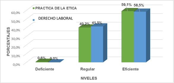 En la tabla 1, se observa que el nivel que predomina en práctica de la ética, es eficiente (59.1%), seguido de regular (40.2%), y deficiente (0.6%). En derecho laboral, predomina también eficiente (58.5%), seguido de regular (41.5%).
