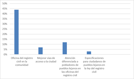 El 85% de los encuestados emitieron sugerencias con el propósito de que se alcance la eficacia jurídica en la prestación del servicio de inscripción extraordinaria de nacimiento. Al respecto, destaca la demanda de una oficina del registro civil en la comunidad (44% de los encuestados). Otros sugieren que en la oficina actual se les ofrezca una atención diferenciada a los pobladores de pueblos lejanos (12%) e incluso una especificidad para estos pobladores en la ley correspondiente (7%). Un comunitario propone la constitución de brigadas permanentes de inscripción extraordinaria de nacimiento (Figura 3).