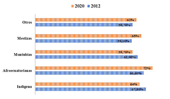 En el año 2012 el Instituto Nacional de Estadística y Censos (2012) publicó una crónica en la cual afirmaba que las mujeres indígenas y afroecuatorianas eran el grupo étnico que más violencia sufre, donde aproximadamente 7 de cada 10 mujeres han vivido algún tipo de violencia. Recientemente, el informe elaborado por la Fiscalía General del Estado (2020) plantea que la mayor tasa de mujeres que han sufrido violencia de género se autoidentifican como afroecuatorianas 72%, luego, esta vez corresponde al grupo de las mujeres autoidentificadas como mestizas 65%.