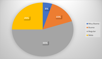 Según la figura, un 55% de los encuestados respondieron esta opción, por lo que se puede decir que no se alcanza un nivel satisfactorio de atención. Un 25% respondió que no hay una buena planificación para el cuidado y atención de la reserva. Mientras que un 15% dio a conocer que si existen buenas estrategias para el cuidado del área de estudios. Finalmente, un 5% indicó que los encargados dan una muy buena atención y manejan un plan de mantenimiento para la Reserva.