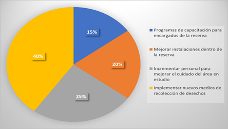 Como se muestra a continuación, los resultados obtenidos referentes a la segunda pregunta del cuestionario aplicado, y dispuesta en la figura 2, indica que el 25% de los habitantes de las zonas aledañas al área protegida de la Reserva Ecológica Cotacachi–Cayapas manifiestan que se debería incrementar personal que se encarga de mantener y proteger el área de estudio. Consecutivamente el 15% de los encuestados mencionan que se debería implementar programas de capacitación para encargados de la reserva. El 40% señala que se deben implementar nuevos medios de recolección de desechos. Finalmente, el 20% de la muestra expresa que se deberían mejorar las instalaciones dentro de la Reserva.