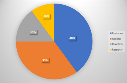 Según la figura 3, el 10% de personas encuestadas consideran que el respeto hacia la naturaleza es una de las principales dimensiones que se deben tomar en cuenta a fin de que se pueda lograr el cuidado satisfactorio del medio ambiente. Mientras que un 40% dio conocer que es necesario que se creen proyectos los cuales vayan destinados a la restauración del medio ambiente para que de alguna forma se intente frenar y retroceder de manera pausada la contaminación ya producida. Y por último un 35% dio a conocer que es necesario que existan planes o capacitaciones para que las personas empiecen a poner en práctica el reciclaje y de esta forma colocar sus desechos de manera correcta y mitigar de alguna forma el deterioro ambiental.