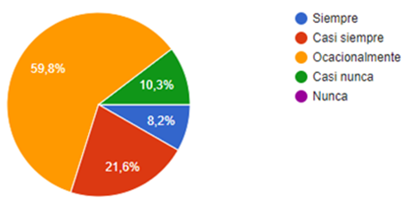 En la figura 1, se muestra que el 59,79 % de los habitantes del sector de Alpachaca de la ciudad de Ibarra, consideran que ocasionalmente el sector no es seguro ya que se cometen delitos, de tal manera que el derecho a la paz social como bien común está siendo vulnerado en el sector urbano de la ciudad de Ibarra.
