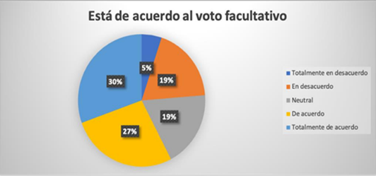 La mayor parte de la población encuestada está de acuerdo en que el voto sea facultativo para los jóvenes menores de 18 años, puesto que se cree que no todos están en la facultad de poder tomar una decisión. Mientras que el otro porcentaje restante no está de acuerdo, ya que manifiestan que sí tienen las capacidades necesarias para decidir. (Figura 1).