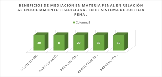 En cuanto a la prevención de la reincidencia delictiva, solo el 10% de los encuestados señala este beneficio de la mediación penal. Esto indica que una minoría de los participantes cree que la mediación puede desempeñar un papel en la prevención de la reincidencia delictiva a través de acuerdos y soluciones centradas en la rehabilitación.