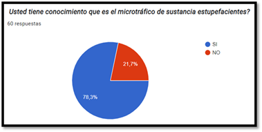 Se evidencia en la figura 2, que cuarenta y siete jóvenes de los cuales representan el setenta y ocho por ciento (78,3%) respondieron que SI conocen lo que es el microtráfico de sustancias estupefacientes mientras que trece jóvenes manifestaron que NO, lo cual representa el veinte y uno por ciento (21,7%).
