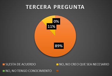 Se observa en la figura 3, que un 89% de la población manifiesta que “SI ESTA DE ACUERDO” con implementar una ordenanza municipal que designe áreas específicas para las trabajadoras mientras que un 11% manifiesta que “NO, NO CREO QUE SEA NECESARIO, crear una Ordenanza municipal debido a cuestiones de incumplimiento por las autoridades anteriores.