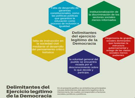 En consecuencia no puede existir democracia si no está legitimada por la instrucción del pueblo, ya que si no es el pueblo el que decide sobre su propio bien (Rousseau, 1969, p. 71), y son otros los que deciden por el pueblo, nos encontraríamos ante “un sistema democrático regido por un sistema no democrático” (Saramago, 2005, p. 41). A continuación adjunto el gráfico 1, mediante el cual se sintetiza el análisis de las delimitantes identificadas para el ejercicio legítimo del derecho a la Democracia en el Estado ecuatoriano: