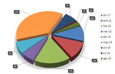 Respecto a modificación de fichas registrales se puede observar que en el mes de mayo del año 2018 se registraron 129 fichas representando el 37%, seguido del mes de febrero del mismo año con 58 fichas que representan el 17%, el mes de julio resulta el que menos fichas se han registrado siendo 3 modificaciones que representan el 1%.