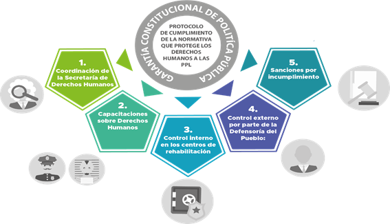 En el Ecuador la CRE en el artículo 85, reconoce como garantía constitucional, las garantías de políticas públicas, las cuales tienen como objeto la obligación de desarrollar inter alia, Protocolos para hacer efectivos los derechos reconocidos en la CRE; razón por la cual, como se ha justificado en la presente investigación, se requiere de un Protocolo de Cumplimiento de la Normativa que proteja especialmente los derechos reconocidos en el artículo 51 de la CRE a favor de las PPL, el cual, contenga lo siguiente: