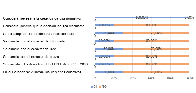 Como resultado se puede rescatar que la mayoría de los investigados consideran que existe una clara vulneración de derechos colectivos en el Ecuador y que de tales derechos es la CPLI el que menos se garantiza por parte del Estado. Respecto a los estándares la gran mayoría de los consultados determinan, que el estado no realiza la adaptación de la información de manera técnica para que la comunidad entienda las partes esenciales de la consulta y tampoco usando el idioma que maneja la comunidad; respecto al carácter de libre, consideran mayoritariamente que existe la aplicación de amenazas, coerción o presión a las comunidades, pueblos y nacionalidades por intereses económicos. En lo concerniente al requisito de que la consulta debe ser previa en su generalidad opinaron que la consulta en el Ecuador pocas veces se la realiza antes de la ejecución de planes y programas de prospección, explotación y comercialización de recursos no renovables.