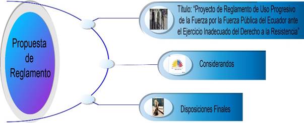 Teniendo en cuenta los resultados arrojados por las encuestas y la importancia de preservar el derecho constitucional a la resistencia y de emplear de forma racional y progresiva la fuerza, se propone expedir una propuesta de Reglamento de uso progresivo de la fuerza ante el ejercicio inadecuado del derecho a la resistencia por parte de la fuerza pública del Ecuador. Esta propuesta debe transitar por las etapas expuestas en la figura 3: