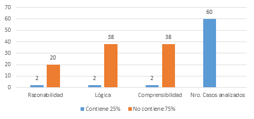Como se puede observar en los resultados de la tabla, las sentencias de acción de protección no contienen motivación, lo único que realizan los juzgadores a-quo es indicar los hechos de forma simple sin expresar razonabilidad, coherencia y lógica de forma holística. En consecuencia, el 75% de fallos no contiene los parámetros que integran el test motivacional de una sentencia y tan solo un 25% llegan a tenerlos (figura 3).
