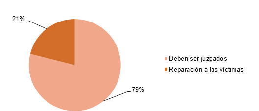 El 79% de los encuestados considera que los delitos de lesa humanidad deben ser juzgados, sin embargo, el 21% considera que bastaría con la reparación a las víctimas (figura 2); lo cual tiene injerencia al momento del cometimiento de estos delitos puesto que es posible que se busque la reparación que pudiera realizarse en sede administrativa y de esta forma no se cumpla con la obligación del Estado de juzgar a los responsables.