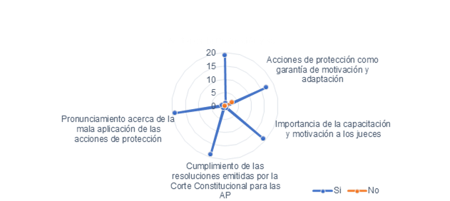 Como resultados de las encuestas aplicadas, se refleja que en su totalidad, los abogados encuestados en la materia en mención son personas conocedoras sobre la temática de las acciones de protección y su aplicación dentro de la legislación ecuatoriana, como también en su mayoría consideran que las acciones de protección son una garantía básica que debe ser aplicadas adaptándose a la norma respectiva; en cuanto a la importancia, en su totalidad los encuestados consideran relevante la capacitación y motivación a los Jueces haciendo referencia a las sentencias en temas de acciones de protección.