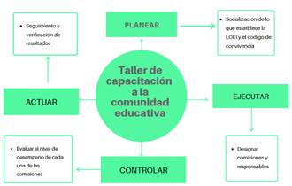 El taller de capacitación a la comunidad educativa se realizó con un enfoque en 4 aspectos definidos en las siguientes fases: planificar, ejecutar, controlar y actuar con el propósito de mejorar el desempeño estudiantil de la institución Unidad Educativa Mariana de Jesús del Cantón El Tambo.