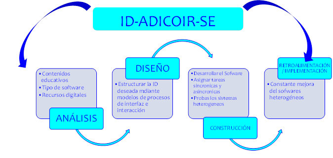 Cabe resaltar que en la esfera de la ID interoperabilidad y para el desarrollo de software educativo, se analizaron algunas métodos como: MERISE, Adaptative Software Development (ASD), Dynamic System Develop Method (DSDM), Feature–Driven Development (FDD), Programación Extrema XP, Modelo Sistémico de Calidad (MOSCA) del Software, Metodología Dinámica para el desarrollo de Software Educativo, Metodología de Desarrollo de Software Educativo una propuesta metodológica y MODESEC (Dueñas, Gómez, Toscana y Caro, 2017). Con esta revisión se pudo estructurar una metodología que facilita la construcción de la ID de Softwares Educativos; dicha metodología se ha denominado con el acrónimo de ID-ADICOR-SE y se estructura con el desarrollo de cuatro etapas indicadas como: Análisis, Diseño, Construcción, y Retroalimentación/Implementación, tal como se muestra en la siguiente figura: