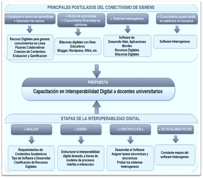 Una de las soluciones para que estos procesos didácticos virtuales se fortalezcan, es tener claro lo que representa la teoría conectivista en virtud de asumir que el aprendizaje, para generar sujetos independientes y auto organizados productores de conocimientos, implica crear y usar redes con las que se pueda estructurar nodos e interconexión eficaces, a través de aplicaciones y recursos educativos digitales. Para ello es menester aplicar un modelo sistémico de interoperabilidad digital en software educativos. En este sentido, la interoperabilidad digital dinamiza los procesos entre software heterogéneos; al mismo tiempo, que facilita la interacción entre el docente, el software heterogéneo y los estudiantes. No obstante, esta sinergia se logra cuando el docente universitario mejora sus competencias digitales, a través de necesarias capacitaciones para ello.