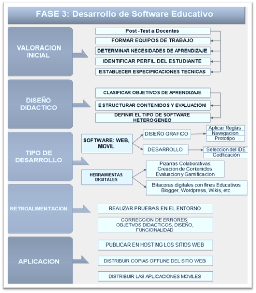 La tercera fase, implica el desarrollo del de Software Educativo siguiendo la metodología ID-ADICOR-SE, ideada para ello. En esta fase se sugiere el uso de Entornos de Desarrollo Integrados (IDE), en desarrollo web Adobe Dreamweaver y en móvil Android Studio, considerando sus ventajas de uso, flexibilidad de código entre otros aspectos. Así mismo se sugiere el uso de varias herramientas digitales como: pizarras colaborativas (Miro, Padlet, Jamboard), creación de contenidos organizadores de ideas (Canva, Genially, Gocongr, Visme), bitácoras digitales (Blogger, Wordpress), evaluación y gamificación (Quizizz, Kahoot.It, Word Wall, Ardora).