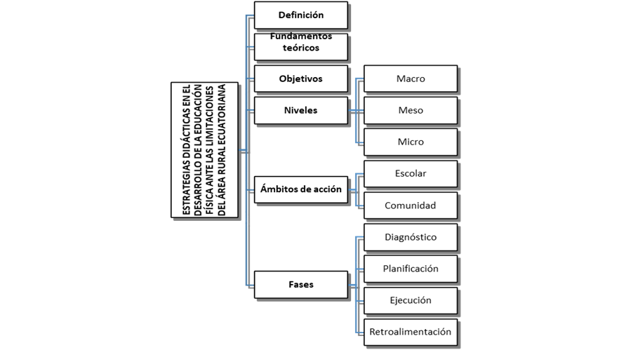 La ilustración 1, muestra la estructura de la propuesta de estrategias didácticas para el desarrollo de la Educación Física en la zona rural de las parroquias Tarqui, Victoria del Portete y Cumbe pertenecientes al cantón Cuenca, provincial del Azuay- Ecuador.
