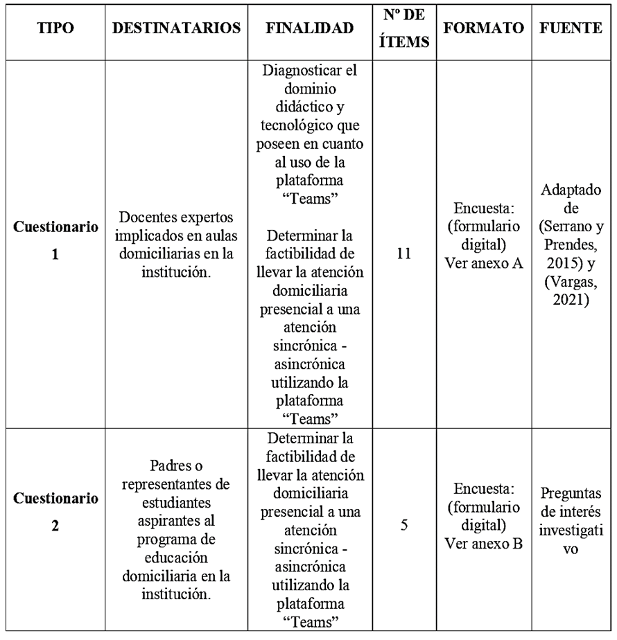 La técnica para la recolección de los datos cuantitativos fueron dos cuestionarios con preguntas cerradas, que se enviaron vía correo electrónico empleando la herramienta “Google forms”. En la Tabla 1 se desglosan las técnicas e instrumentos de recolección de información útiles para dar respuesta a los objetivos del presente estudio.