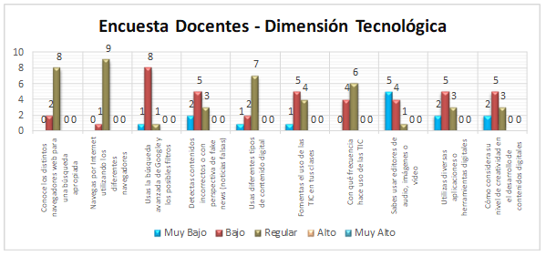 Los resultados de la encuesta nos muestran que, de las competencias digitales propuestas, existe un nivel muy bajo en esta dimensión, lo que se demuestra con un 12,73% de dominio; mientras que el 37,27% tiene conocimientos bajos y el 40,91% conoce regularmente las interrogantes planteadas en esta dimensión, teniendo un total de 90,91 % entre un nivel muy bajo, bajo y regular. Se puede inferir que el nivel de las competencias digitales de los docentes del área de Ciencias Sociales es bajo, ya que manifiestan tener dificultades al momento de usar los diferentes navegadores y no saben realizar un filtrado de información, además no tienen el suficiente dominio de competencias para interactuar a través de las tecnologías digitales lo que se vio reflejado en las plataforma Teams propuesta por el Ministerio de Educación y en aplicaciones o herramientas para desarrollar contenido digital.