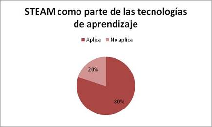 En la figura 2 se puede observar que el 80% de los estudiantes de ingeniería opinaron que la metodología STEAM aplica como parte de las tecnologías de aprendizaje, mientras que el 20% opinó que no aplica. Este resultado concuerda con Aravena et al. (2022) quienes suponen que “…hoy más que nunca, los avances de la sociedad giran en torno a STEM, donde los ingenieros son claves para su desarrollo” (p. 51). Adicionalmente Cobos et al. (2020), por su parte, agregan que “…la tecnología es una estrategia formativa para la construcción del conocimiento” (p. 160).