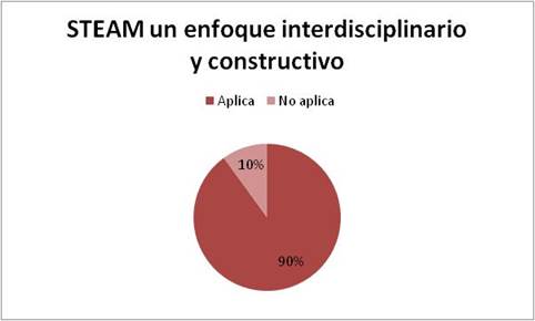 En la figura 5 se puede apreciar que el 90% de los estudiantes de ingeniería opinaron que la metodología STEAM aplica como un enfoque interdisciplinario y constructivo, mientras que el 10% opinó que no aplica. Este resultado concuerda con Domínguez et al. (2019), quienes afirman que “…STEM enfatiza un enfoque educativo interdisciplinario donde los conceptos académicamente rigurosos se acoplan a lo real”. Saborío y García (2021) también expresan que “de igual forma, permite que haya interacción y construcción de conocimiento con personas docentes de diversas disciplinas, e incluso con miembros de su propia comunidad” (p. 144).