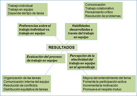 Tal como se visualiza en la figura 1, durante el estudio se evaluaron aspectos como: las habilidades desarrolladas a través del trabajo en equipo (comunicación, trabajo colaborativo, pensamiento crítico y resolución de problemas); la percepción de la efectividad del trabajo en equipo en el aprendizaje (mejora en el entendimiento del tema, fomento de la participación activa, incremento en la motivación y promoción del respeto mutuo); la evaluación del proceso de trabajo en equipo (organización de las tareas, comunicación interna del equipo, resolución de conflictos y distribución equitativa de tareas) y, finalmente, las preferencias sobre el trabajo individual vs. el trabajo en equipo (trabajo individual, trabajo en equipo y depende del tipo de tarea). Todos ellos son explicados detalladamente en las tablas 1, 2, 3 y 4.