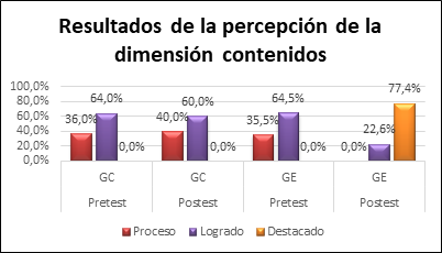 La figura 3, evidencia que el 64% de los estudiantes del grupo de control en el pre-test, se hallaban en la escala logrado, y el 64,5% del grupo experimental consiguieron ubicarse en esta misma escala. En el pos-test, el 60% de los estudiantes del grupo control alcanzaron ubicarse en la escala logrado; en cambio el grupo experimental, a continuación del empleo de la estrategia’ valorando evidencias de aprendizaje’, superó al grupo de control, al transitar la mayoría de estudiantes, 77,4%, de la opción logrado a la escala logro destacado; mostrando estos resultados, la validez de la estrategia en la dimensión contenidos de la retroalimentación formativa de la competencia ‘explica el mundo físico basándose en conocimientos del área de ciencia y tecnología’.