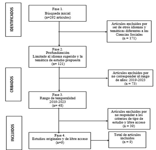 En la Fase 2 y 3 de profundización, como se muestra en la figura 1, el análisis se limitó a los artículos relacionados al idioma y hábitos lectores en la educación básica, donde se excluyeron n=171 artículos, quedando así un total de n=121 publicaciones. En la Fase 3, se aplicaron los criterios relacionados al rango de años 2019-2023, excluyéndose un total de n=73 artículos y obteniendo sólo la cantidad de n=48 artículos. Finalmente, en la Fase 4, se aplicaron los criterios de inclusión relacionados al tipo de estudio y libre acceso, excluyéndose n=39 publicaciones y, quedando para el registro de la revisión sistemática final, n= 9 artículos.