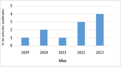La figura 2, muestra la cantidad de investigaciones publicadas entre los años 2019 al 2023, evidenciándose cierto incremento hasta el año 2020; no obstante, en el año 2021, la cantidad de artículos disminuyó moderadamente por la dispersión del virus del COVID-19, momento en el cual el hecho educativo empleaba mayormente la modalidad en línea, dando prioridad a la salud física y socioemocional de los estudiantes y docentes en todo el mundo.