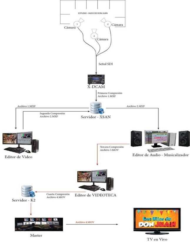 El primero en tomar el archivo. MXF será el editor de video, quien realizará el montaje adecuado bajo la supervisión del guionista y del productor encargado de la serie. Una vez concluida esta labor, el editor realizará sistemas operativos y software del canal con un proceso de cambio de aproximadamente 1 año. Este archivo no sufrirá ningún tipo de compresión adicional, puesto que ya la tuvo al momento de realizar la exportación al servidor K2. Además, el editor de video debe realizar la exportación. MXF sin transiciones, ni placas para el editor de color. Y así, debe ser almacenado en el servidor ISIS, para que el musicalizador pueda iniciar su proceso de edición y corrección de audio de las diferentes escenas que contiene ese capítulo.