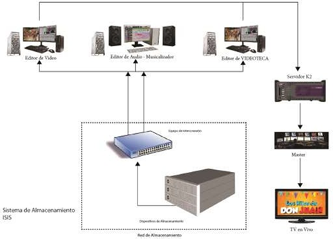 En función de estas descripciones interpretativas, también se desvela la posibilidad de mejorar dicho flujo de trabajo, a partir de que TC Televisión cambie el sistema de almacenamiento XSAN, por ISIS. Pero ¿Por qué este sistema ISIS?, porque es una estructura conformada por un dispositivo de almacenamiento AVID, que se encuentra conectado a un equipo de interconexión que permitirá el acceso total de las fuentes conectadas a este sistema (Figura 2). Estas fuentes podrán trabajar en conjunto y manipular los diferentes archivos al mismo tiempo.