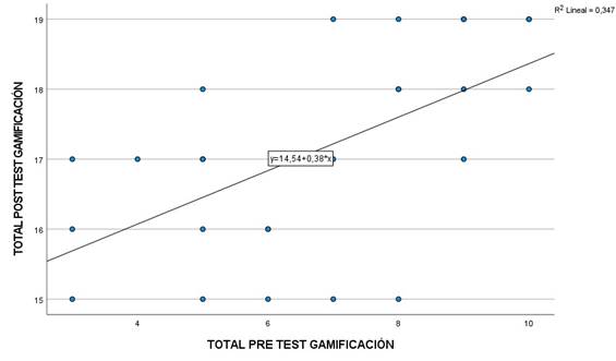 Asimismo, el coeficiente de determinación R² de 0,347 indica que la gamificación explica el 34,7 % de los cambios observados en los procesos de lectura de los estudiantes. Al analizar las comunalidades, se observa que la gamificación genera variaciones significativas, con porcentajes que oscilan entre el 74,4 % y el 52,9 %; el análisis de regresión lineal arroja un valor de intersección de 14,543 con una significancia estadística (p = .000), lo que representa el promedio esperado en el post test cuando las calificaciones del pretest son iguales a cero. Esto implica que los estudiantes con mejores resultados iniciales tienden a mantener un desempeño destacado tras la intervención. Los resultados reflejan una influencia positiva de moderada intensidad de la estrategia de gamificación en el desarrollo de los procesos de lectura en los estudiantes evaluados.