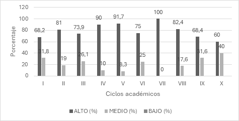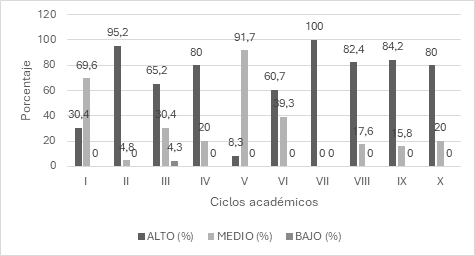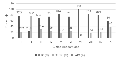 A partir del octavo ciclo, se mantiene una tendencia elevada en la categoría alto (94.1% en el octavo ciclo, 94.7% en el noveno ciclo), pero en el décimo ciclo hay una disminución a 66.7%, con un aumento en la categoría medio (33.3%).