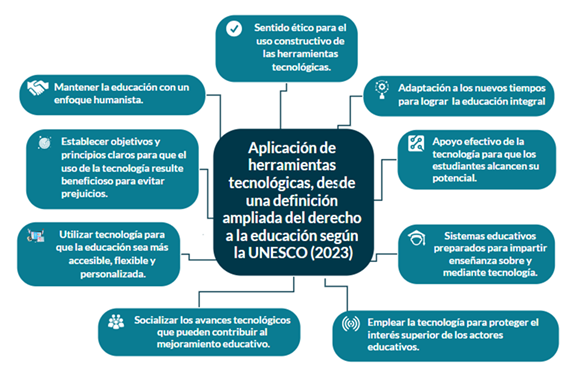 Se puede indicar, que la aplicación de las herramientas tecnológicas, desde una definición ampliada del derecho a la educación, según la UNESCO (2023), se distingue por: la adaptación a los nuevos tiempos para lograr la educación integral, el apoyo efectivo de la tecnología para que los estudiantes alcancen su potencial, sistemas educativos preparados para impartir enseñanzas sobre y mediante la tecnología.