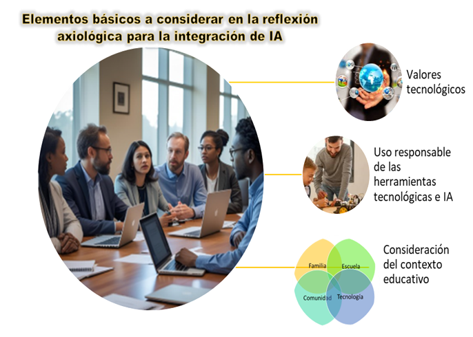 Entre los elementos básicos a considerar en la reflexión axiológica para la integración de IA se aprecian: los valores tecnológicos, el uso responsable de las herramientas tecnológicas y la IA, y la consideración del contexto educativo (Regan y Jesse, 2018).