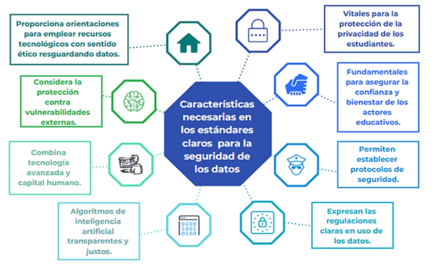 Se considera fundamental que las instituciones educativas implementen políticas claras sobre el manejo de datos. Asimismo, se valora la necesaria transparencia en relación a la manera en la cual se utilizan dichos datos. Estos requerimientos son definidos, junto al consentimiento informado, como elementos esenciales que deben tenerse en cuenta para el desarrollo de tecnologías educativas basadas en IA (Bahar et al., 2023). De este modo, la implementación de estándares propios es fundamental para disminuir riesgos, sugiriendo que se deben adoptar estándares más estrictos en relación con la encriptación y el almacenamiento de datos en la nube. El cumplimiento de todos estos requerimientos garantizaría una mayor protección contra vulnerabilidades externas (Rosado et al., 2024).